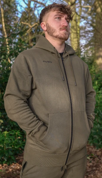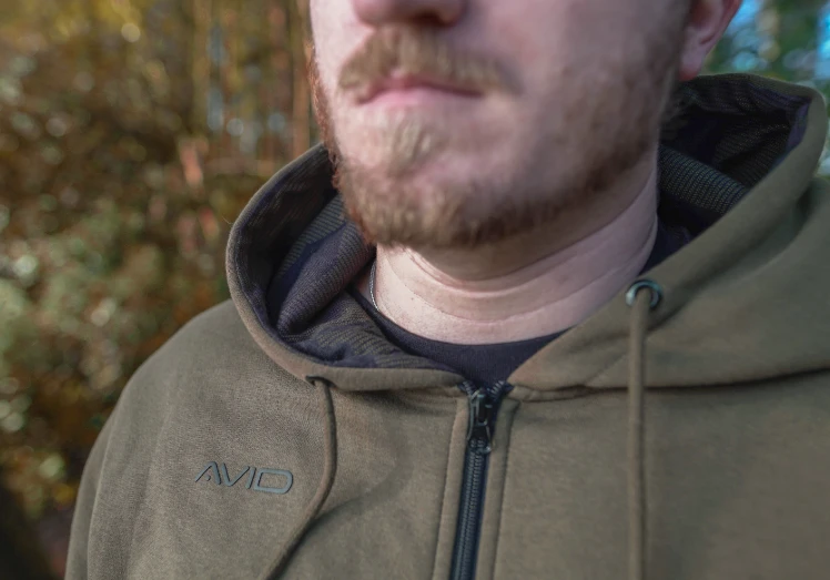 The Avid Distortion Zip Hoodie, a khaki-green hoodie that features unique Avid Carp Distortion Camo styling on the inside of the hood. This luxurious zippered hoodie is the perfect garment that can be used as an extra layer in combination with other clothing in cool weather conditions or as an outer layer in the warm months. Made of high quality stretch fabric and this classic garment is also great for casual wear thanks to its modern design.