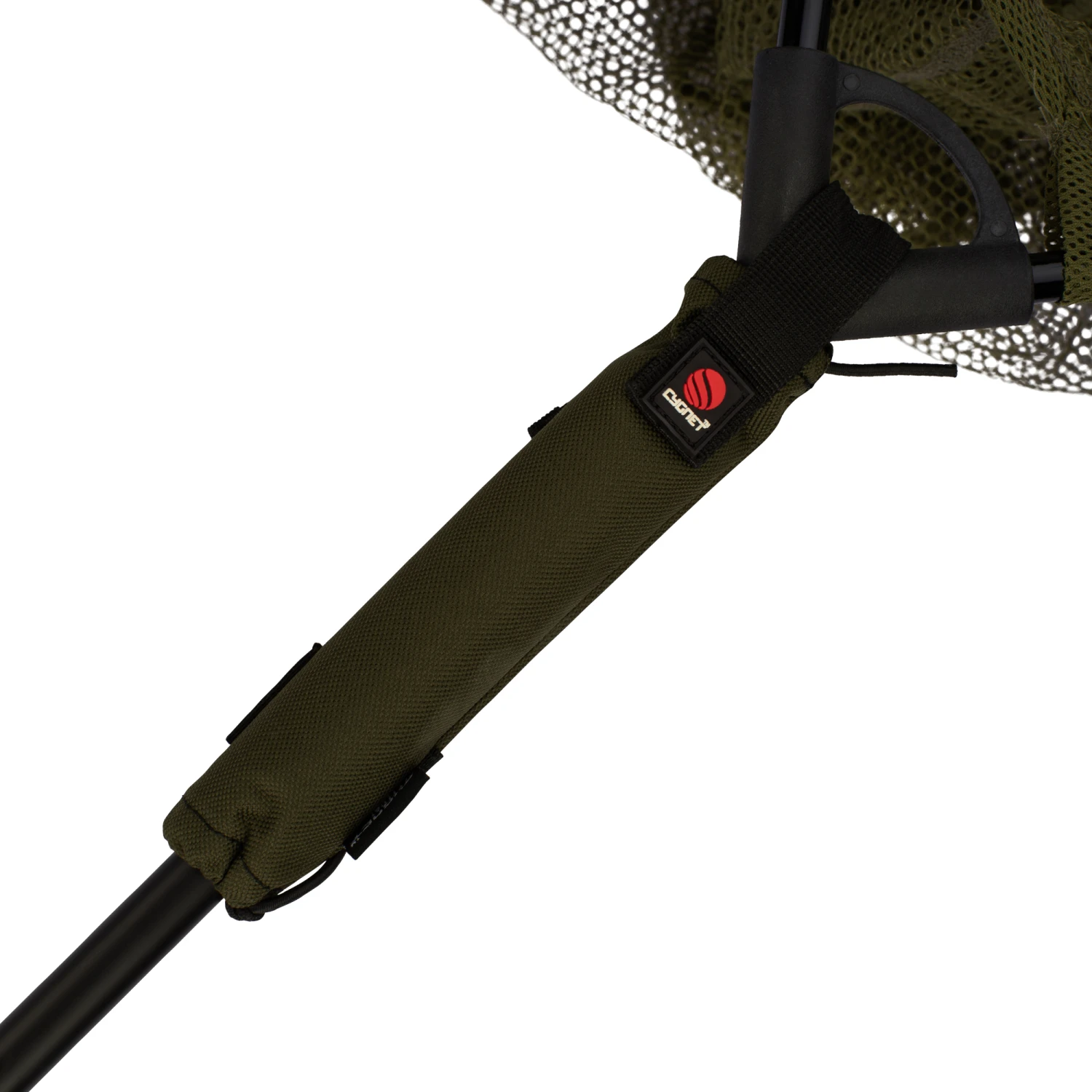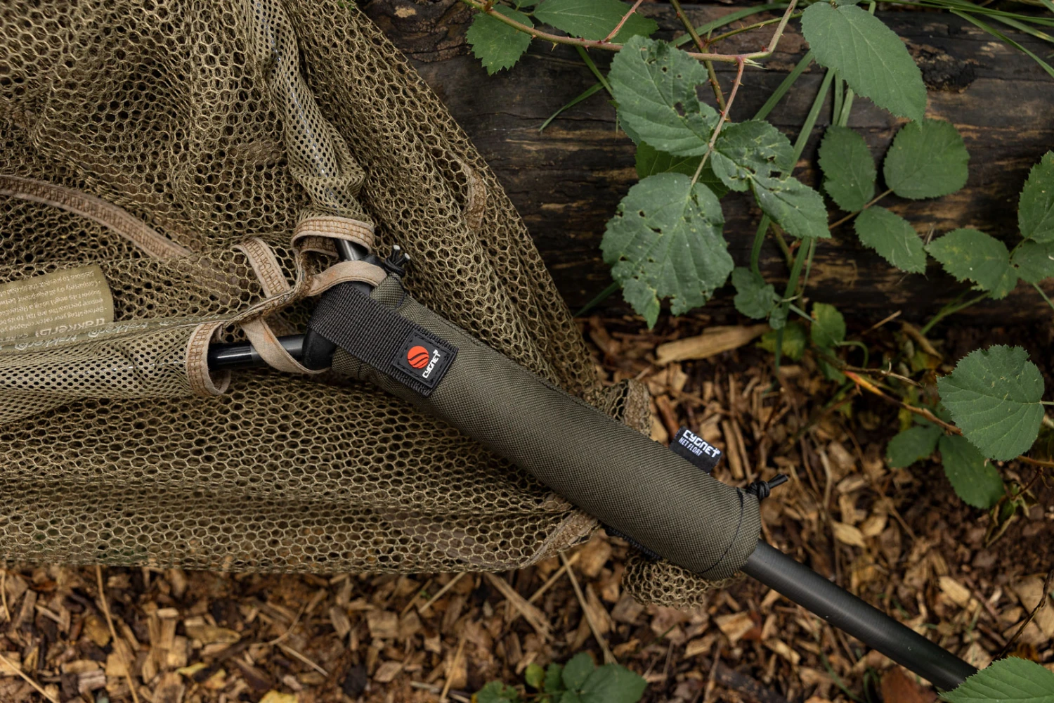 A Net Float is slid onto the landing net handle and then needs to be attached with a Velcro strip behind the spreader block of the net.