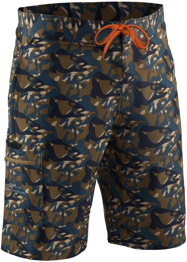 These board shorts are perfect for anglers who love warm weather. Tailored for athletic movement and maximum freedom of movement. Packed with thoughtful fishing features like a convenient reinforced tool pocket. Fish Head camouflage design looks cool and helps you hiding when sneaking into shallow waters. The quick-drying feature means getting a wet suit is no problem either!