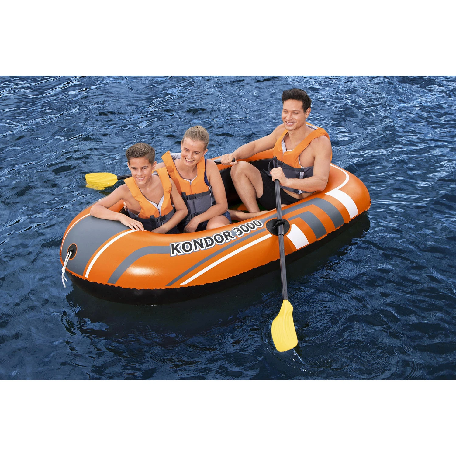 Everything you need to enjoy the water. The Kondor 3000 Inflatable Boat is a quality inflatable boat that you will enjoy the summer to the fullest! Made of vinyl material it is resistant to sweat and salty water. The set includes 2 oars and an inflation pump and is easy to inflate and deflate.