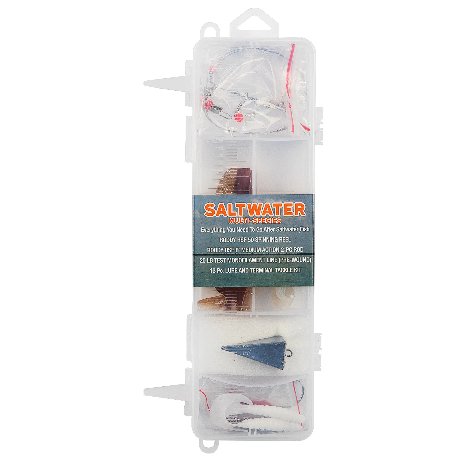 The Roddy saltwater multi-species combo with tackle kit has everything you need to get you out on the water and catch fish today. This combo features a 8′ 2-piece rod, reel with line, and 13-piece tackle kit.