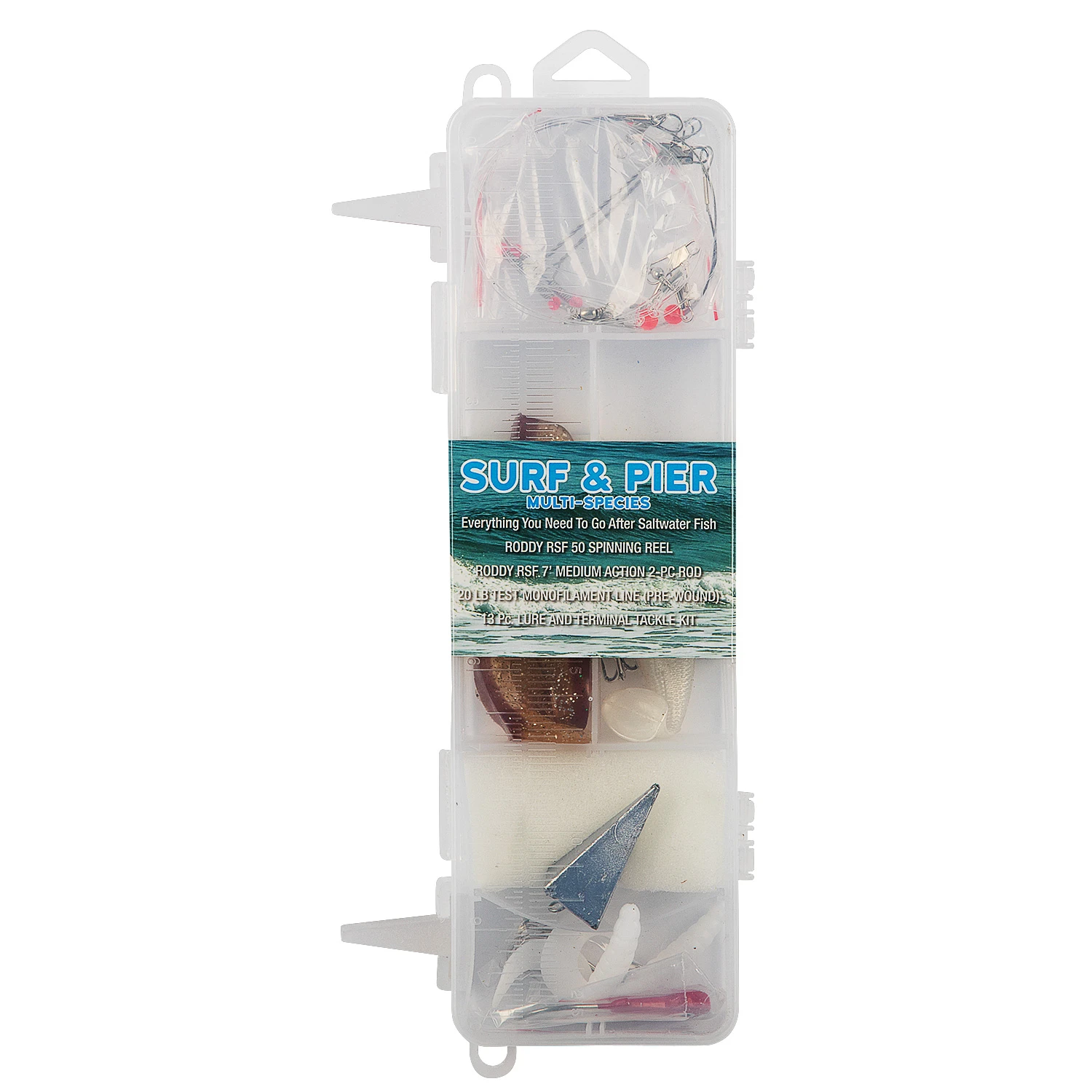The Roddy Surf & Pier combo with tackle kit has everything you need to get you out on the water and catching fish today. This combo features a 7′ 2-piece rod, reel with line, and 13-piece tackle kit.